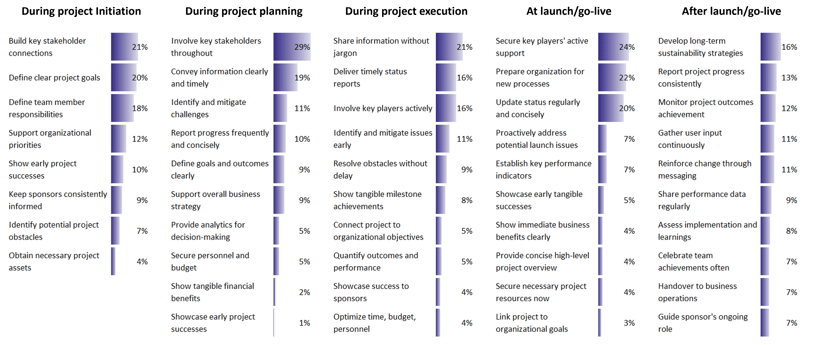 Participants also described the most important types of activities a change sponsor can perform. The data was broken into three major project phases: start-up (planning), design and implementation. The activities and steps were further categorized by the primary target audiences: