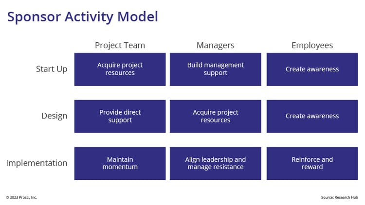 Prosci's Sponsor Activity Model illustrates the responsibilities sponsors undertake during each project phase (start-up, design and implementation). The activities required for each box in this figure are intended to be general descriptions for the category.