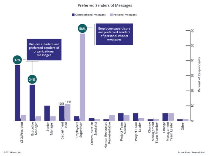 Best practices research reveals two preferred senders of messages related to change. When it comes to the business reasons for the change, employees want to hear from the senior leaders authorizing and funding the change. They want to understand why the change is taking place, risks of not changing, and competitive and customer issues. When the message concerns the personal impacts of the change, or "What's In It For Me" (WIIFM), employees want to hear from their immediate supervisors. A communications plan that does not incorporate these findings will be less effective.