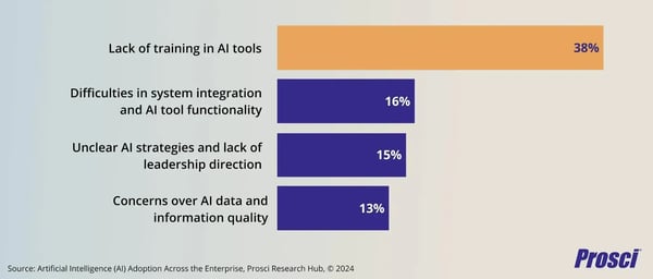 Many organizations focus solely on implementing AI tools without preparing their workforce, leading to poor adoption and wasted investment. In fact, an independent study into personal, team and organizational AI usage conducted by Prosci, surveying 1,107 professionals across multiple industries, found that 63% of organizations cite human factors as a primary challenge in AI implementation.