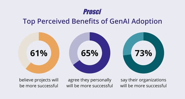 Yet, when implemented effectively, GenAI adoption is perceived to drive a number of benefits; the same study revealed that 61% of respondents believed it would make projects more successful, 65% thought it would boost their personal success, and 73% said their organizations would be more successful as a result of GenAI adoption.
