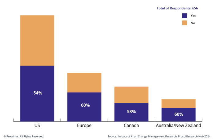 Our research of 656 respondents highlighted regional differences in AI usage, with professionals in Europe using AI in their change management practice the most, followed by the US, Australia/New Zealand and Canada respectively.