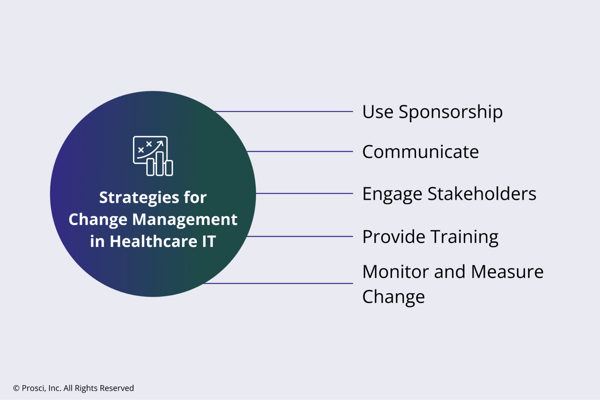 Effective change management strategies for healthcare IT vary with each institution and change. Here are five strategies commonly deployed in healthcare settings: