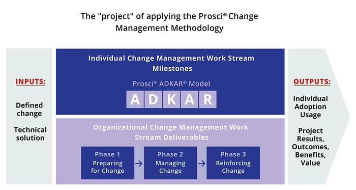 There are two main outputs of applying change management. At the individual level, the output is successful transitions (through the ADKAR Model), which result in higher levels of adoption and usage of the solution by employees. At the project level, the output is greater benefit realization, results and outcomes delivery, Return on Investment and overall success.