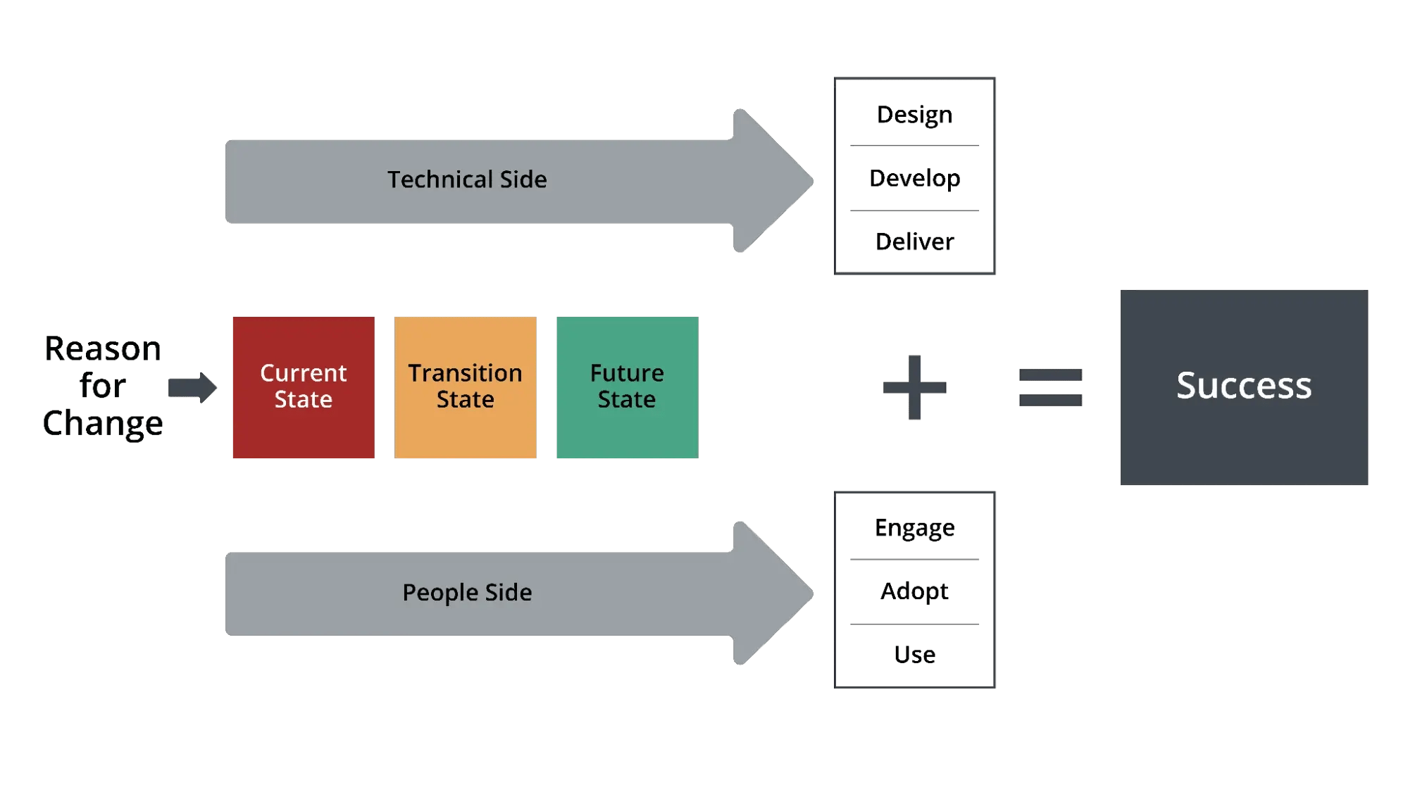 The project manager or project management team focuses on the project’s design, development and deliver—or the technical side of the change. Working with the change practitioner, the project manager ensures that the technical and people sides of the change move forward in unison, aligning the project delivery with the stages of change.