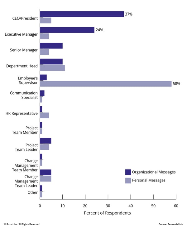 Prosci research shows that employees have preferences for change management communication. Front-line employees prefer to receive messages about business impacts of change from the CEO or another executive but prefer personal messages about change from people managers.