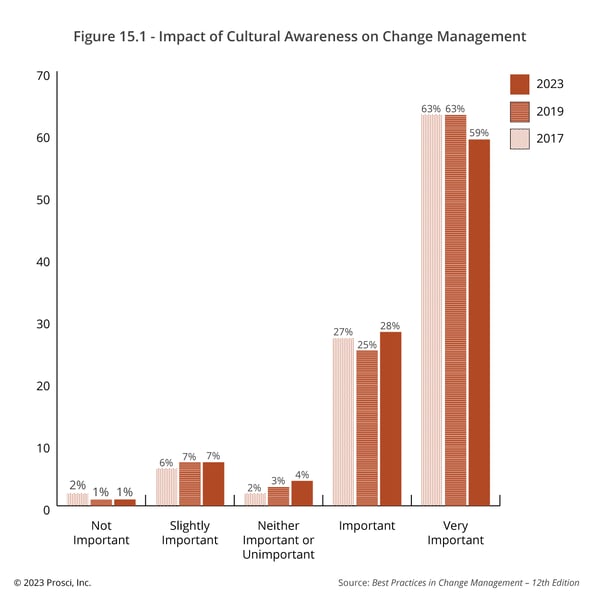 Culture has a huge impact on our change management projects. Our Best Practices in Change Management research reveals that 88% of participants find cultural awareness to be important or very important to a change management initiative. Being culturally aware enables change practitioners to customize their change management approach, apply culturally specific adaptations while avoiding culturally specific obstacles, and create effective communication plans with the culture of the audience in mind.