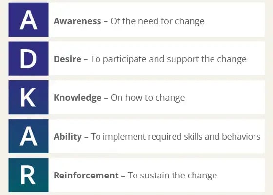 Your digital strategy also needs plans to manage and help people adopt change at the individual level. To do this, practitioners use the Prosci ADKAR Model. It helps people through their individual change journeys by enabling them to achieve Awareness, Desire, Knowledge, Ability and Reinforcement.