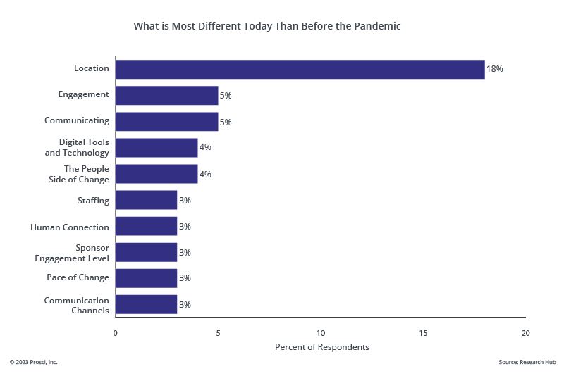 Participants in Prosci's research on the Top Contributors to Change Success in a Post-Pandemic World revealed that the most different aspects of change since before the pandemic were location (in-office, hybrid, remote, etc.), engaging employees virtually, and communicating with employees in a hybrid workplace.