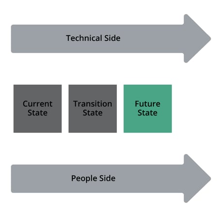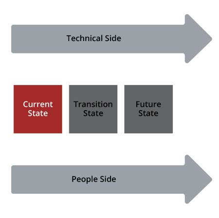 Like any other project, there is a current state or how things are done today. Like any other project, there is a future state or how things will be done after implementation. And like any other project, there is a technical side and a people side to the transition state between the current and future states. This simple but universal model of change is applicable to a variety of organizational efforts, but here we are applying it to one particular effort: institutionalizing change management.