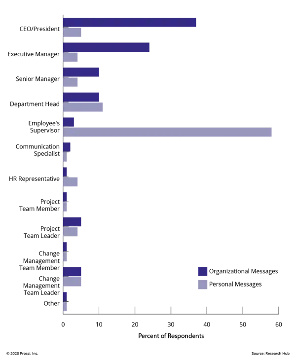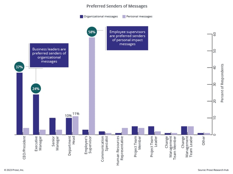 Who are the change leaders? Prosci Best Practices in Change Management research tells us that senior leaders are the preferred senders of organizational messages, and people managers (direct supervisors) are the preferred senders of personal impact messages.
