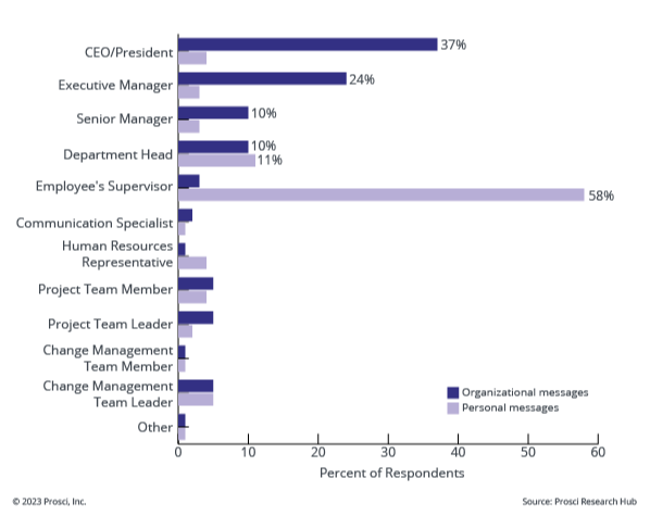 Prosci research found that employees prefer to receive organizational messages about change from the CEO, president, or another executive. They prefer communication about the personal impact of change to come from their direct supervisor.