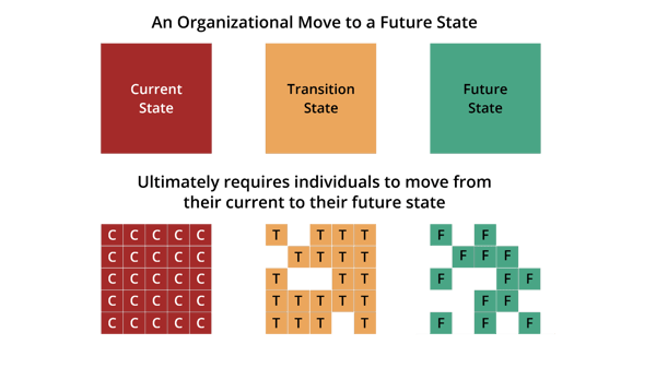 The result can be a “Swiss cheese” change process in which only some team members make it to the “future state.” To avoid this, our ADKAR Model supports individuals in achieving all the elements they need to be successful from the current state to a future state.