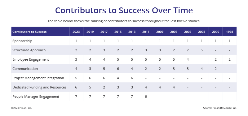 Prosci ‘s 25 years of research on the Best Practices in Change Management represents the largest body of knowledge in the change management discipline. This research shows that projects with effective change management are 7X more likely to meet or achieve objectives than projects with poor change management. Even fair change management correlates with achieving a 3X likelihood of success.