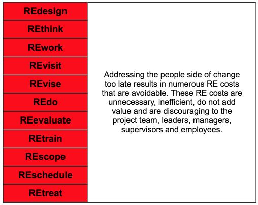 Think about your experience working on projects and initiatives. Have you experienced one or more of the common RE costs below? Could you have avoided them by addressing the people side of change earlier in the project lifecycle?