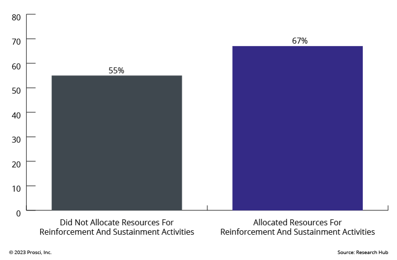 Participants who allocated resources to reinforcement and sustainment activities reported greater success rates on their projects. The figure below shows that 67% of participants who allocated resources to reinforcement and sustainment activities met or exceeded project objectives, compared to 55% of those who did not allocate resources to reinforcement.