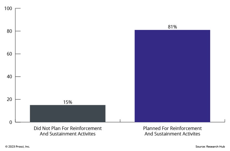 From a change management perspective, reinforcement can be difficult because once a change is finished, we often move on to the next change. It takes concerted effort and time to make sure a change "sticks," and given the scarce resources and change saturation that many organizations face, reinforcement efforts often fall short. We see this scenario playing out in the data. While a significant number of organizations (81%) are planning for reinforcement and sustainment activities, far fewer (55%) are dedicating resources to the effort. The data speaks for itself: organizations that plan and resource for reinforcement are more likely to meet or exceed project objectives than organizations that neglect this critical step in the change process.