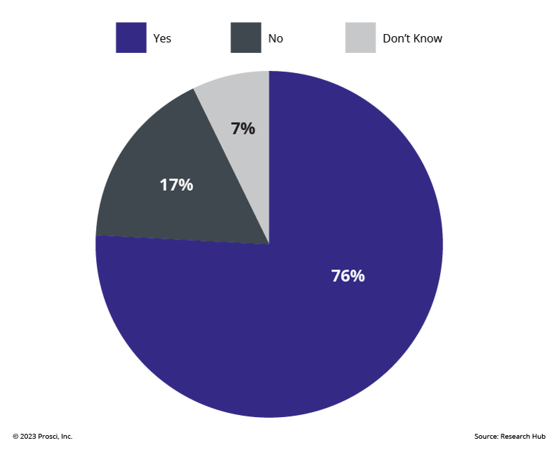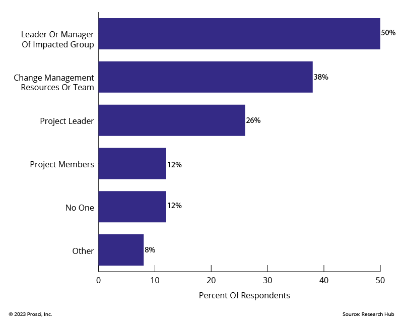 Participants identified who was responsible for the reinforcement and sustainment activities on their change initiative. Half of participants said it was the leader or manager of the given impacted group, while 38% reported that the change management resource or team was responsible for this effort. (Participants were able to select multiple roles, resulting in a total of more than 100%.)