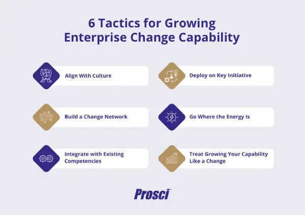 Prosci's exploration with 10 industry leaders uncovered six primary tactics for enterprise change growth, demonstrating a "universal theme, unique application" approach.