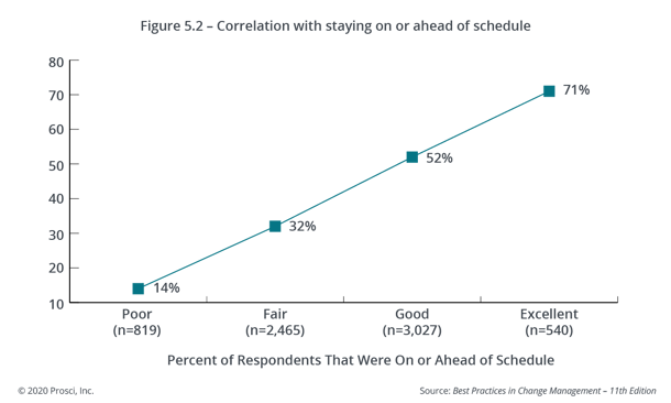 Effective change management also correlates directly with the ability to stay on or ahead of schedule. With excellent change management, your project is nearly five times more likely to be on or ahead of schedule than with poor change management. Again, in addition to meeting project objectives, the better you manage the people side of change, the more likely your project is to finish on time.