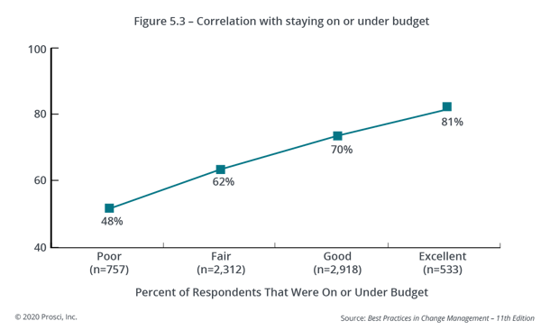 The figure below shows the observable correlation between change management effectiveness and the ability to stay on budget. With excellent change management, your project is nearly 1.5 times more likely to stay on or under budget than with poor change management.