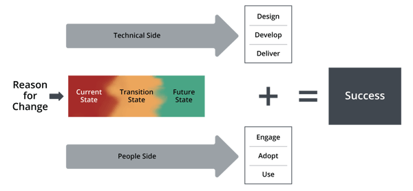 Prosci's Unified Value Proposition model provides a framework that identifies the key elements of implementing a change within an organization. The Unified Value Proposition shows how the technical side of change (project management) and people side of change (change management) must come together to ultimately deliver success for a change initiative. Success is defined as meeting or exceeding project objectives and realizing organizational benefits.