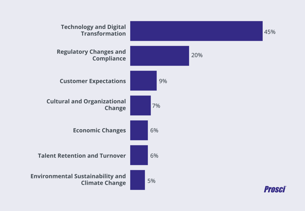 The emergence of new technology is at the root of many financial sector issues. In fact, our Best Practices in Change Management benchmarking survey of leaders in the banking industry highlights that technology and the need for digital transformation is the biggest challenge facing the industry over the next five years.