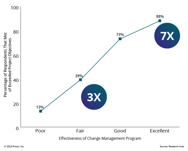 Most importantly, organizations that consistently apply excellent change management to projects and initiatives are 7X more likely to meet or exceed project objectives.