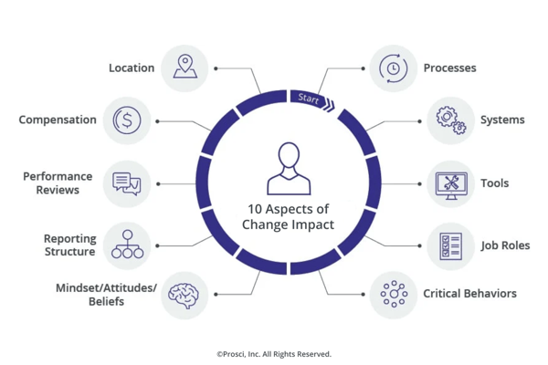 Implementing any organizational change can impact aspects of the way people do their jobs, from systems and tools to reporting structures and critical behaviors.