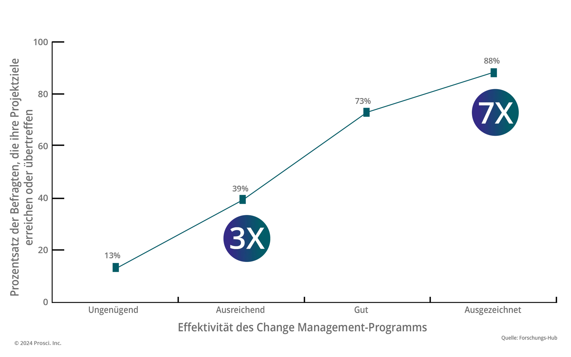 Die Untersuchungen von Prosci belegen fortlaufend, dass Organisationen mit herausragendem Veränderungsmanagement bei der Umsetzung von Wandel deutlich erfolgreicher sind.