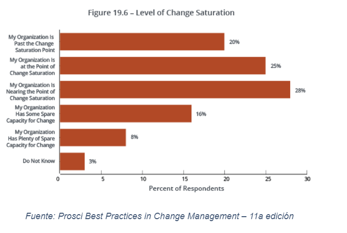 La saturación de cambios se produce cuando el número de cambios que está implementando excede la capacidad de las personas de su organización para adoptar y utilizar esos cambios de manera eficaz. Cada vez más común, la saturación del cambio afectó a más del 73% de los encuestados en el informe de Best Practices in Change Management más reciente de Prosci, quienes afirmaron que sus organizaciones estaban cerca, en o más allá del punto de saturación.
