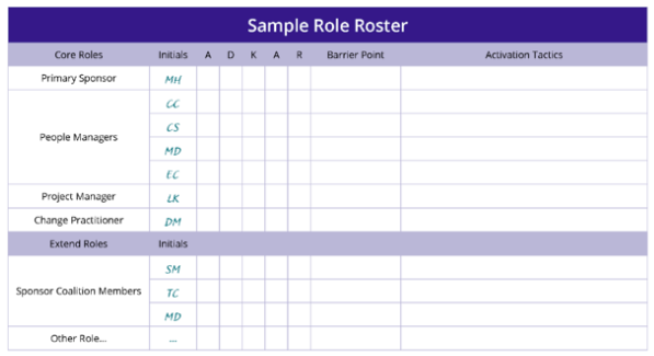 La nueva lista de funciones permite identificar las funciones básicas necesarias para el éxito del cambio organizacional y ayudar a las personas que las desempeñan a cumplir sus responsabilidades como patrocinadores, gestores de personas, gestores de proyectos y empleados de primera línea afectados por el cambio. El Modelo ADKAR también se aplica para apoyar la evaluación y el cumplimiento de las funciones, incluida la función de patrocinador.