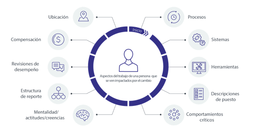 Como acabamos de ver, cuando el cambio llega a la organización, los beneficios que aporta a la empresa y a los trabajadores son múltiples. Sin embargo, el cambio trae consigo otras implicaciones. En concreto, para el lado humano del cambio (los trabajadores) hay aspectos del trabajo de una persona que se ven afectados por el cambio.