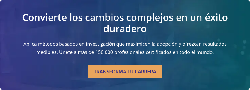 La aplicación de un enfoque eficaz de gestión del cambio involucra a las personas en su cambio, impulsa una mayor adopción y aumenta la probabilidad de éxito de su proyecto o iniciativa. Los estudios de Prosci demuestran sistemáticamente que los proyectos con una excelente gestión del cambio tienen más probabilidades de éxito.