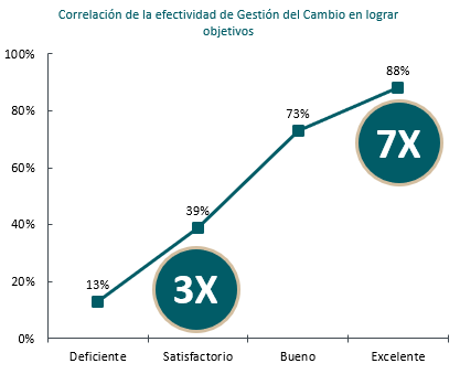 De los participantes que contaban con excelentes programas de Gestión del Cambio, el 88% cumplió o superó los objetivos. De aquellos con buenos programas de Gestión del Cambio, el 73% cumplió o superó los objetivos, mientras que el 39% con programas satisfactorios de Gestión del Cambio cumplió o superó los objetivos. Solo el 13%, o aproximadamente 1 de cada 8, de aquellos con programas de Gestión del Cambio deficientes cumplieron o superaron los objetivos.