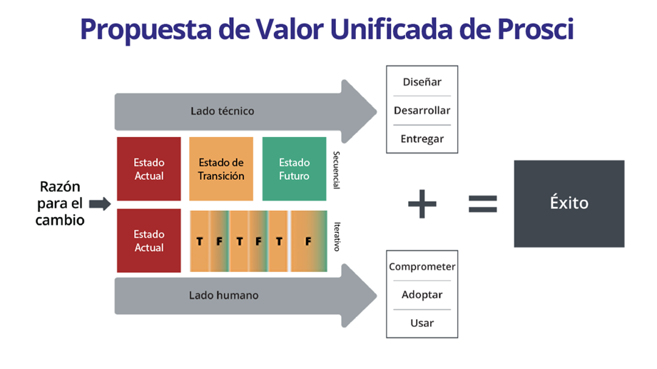 Las disciplinas de Gestión del Cambio y Gestión de Proyectos tienen cada una un papel que desempeñar en las transformaciones digitales, pero integrar efectivamente las dos disciplinas permite el éxito del proyecto y, en última instancia, su retorno de la inversión (ROI). La Propuesta de Valor Unificada de Prosci ilustra cómo funciona esto.