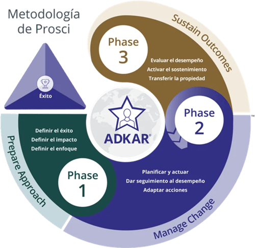 La Metodología Prosci permite a las organizaciones gestionar el cambio con éxito al apoyar a los empleados impactados en sus caminos ADKAR y facilitar el cambio organizacional a través del Proceso de 3 Fases de Prosci.