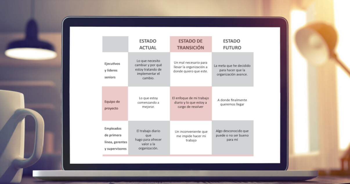 Esta es la esencia de Gestión de Cambio: apoyar a las personas a través de sus transiciones personales para que un proyecto o iniciativa alcance los beneficios esperados.