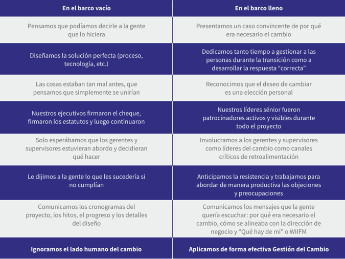 Para ayudar a representar esto visualmente, imagina dos barcos: uno que represente un proyecto completo en el que el lado humano del cambio se gestionó de manera efectiva y otro en el que no. En ambos casos, se construyó un hermoso barco, y ahora necesita una tripulación de trabajo completa. Sin embargo, un barco quedó aislado y vacío mientras que el otro barco estaba lleno de vida y personas que "subieron a bordo".