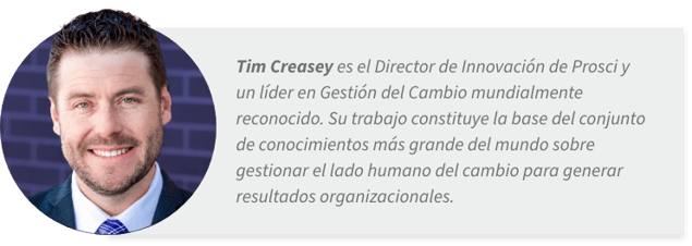 Los cambios finalmente cobran vida a través de las personas que tienen que hacer su trabajo de manera diferente como resultado de un proyecto o iniciativa. Ya sea que el proyecto involucre un proceso que impacte a 15 personas, una nueva tecnología que impacte a 150 o una transformación que impacte a 15,000, el éxito del proyecto está inextricablemente vinculado a la adopción y el uso exitosos por parte de esas personas. ¿Subieron a bordo o se quedaron en la orilla?