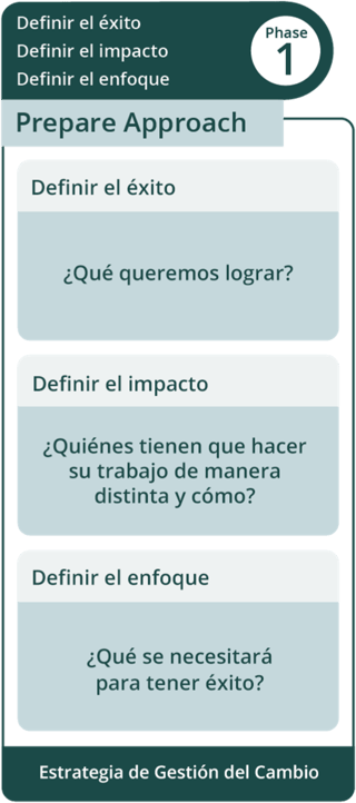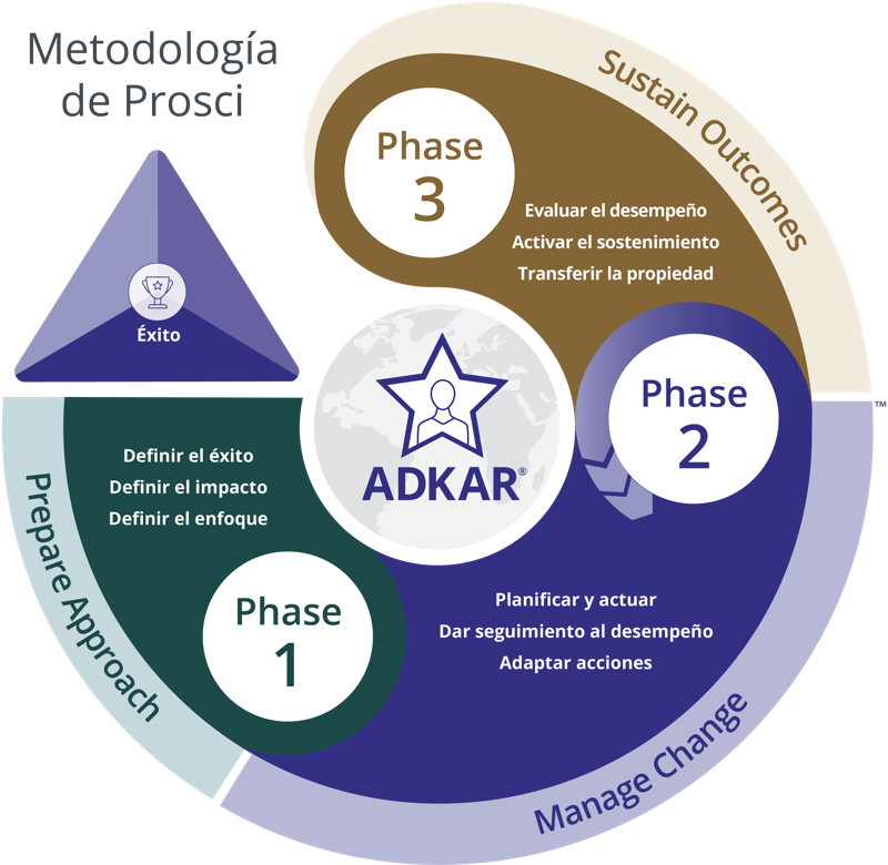 A través de este proceso de Gestión del Cambio organizacional, los profesionales de Gestión del Cambio trabajan en tres fases (Fase 1 - Preparar el Enfoque, Fase 2 - Gestionar el Cambio, Fase 3 – Sostener los Resultados) para alcanzar el éxito del proyecto.