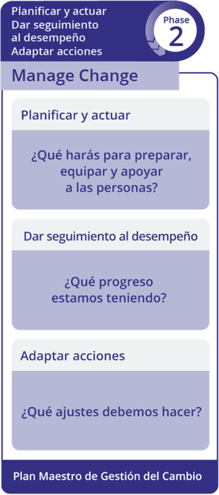 La segunda fase del Proceso de 3 Fases de Prosci da vida a la Estrategia de Gestión del Cambio. Las actividades en esta fase implican el desarrollo de planes y acciones que ayuden a mover a las personas y a la organización a través de las transiciones de ADKAR. Las tres etapas de la Fase 2: Gestionar el Cambio incluyen: