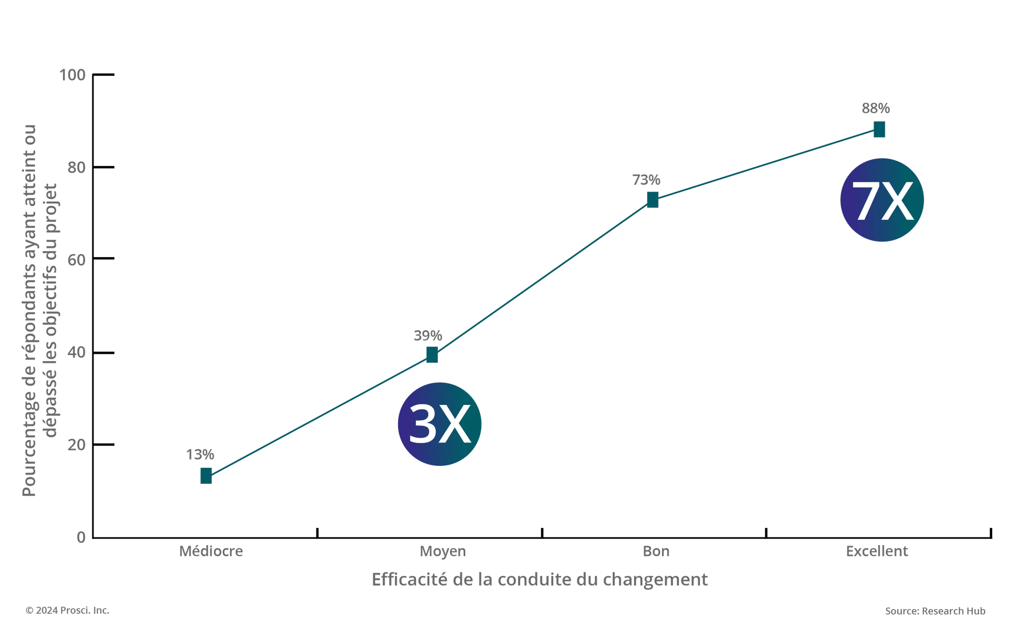 Les études de Prosci démontrent de manière récurrente que les organisations dotées d'une gestion du changement de premier ordre rencontrent un succès plus marqué dans leurs démarches de transformation.