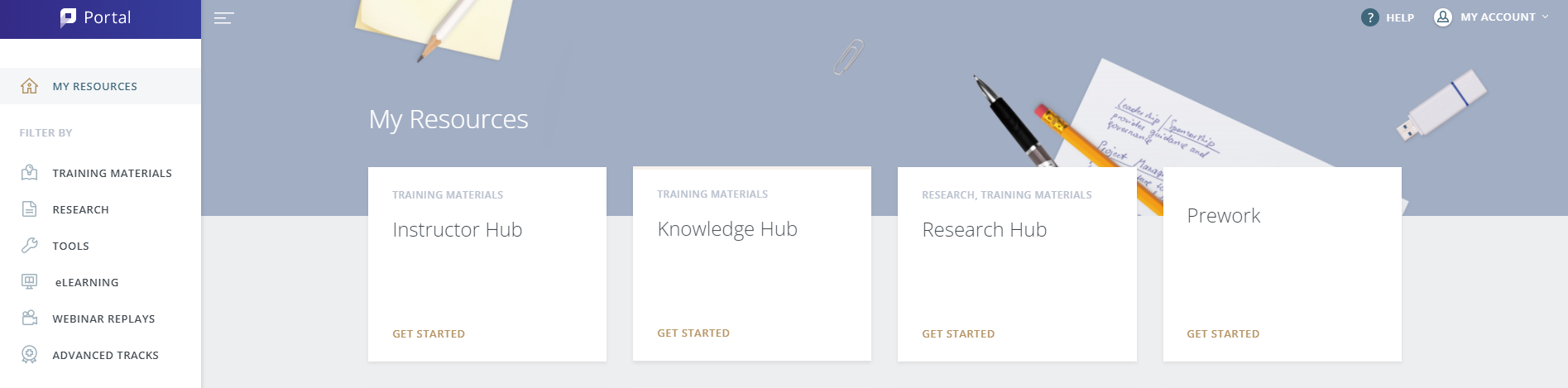 Note: If you have multiple Portal accounts/profiles, confirm you are logging in with the email you registered for the program with and ensure that you are completely logged out of any other accounts/profiles. You can find additional support here on logging out of multiple accounts. - Activated program tools will appear under the My Resources page in the Portal. Please confirm that you are on the My Resources page of the Prosci Portal (see below).