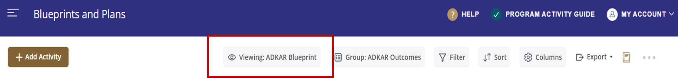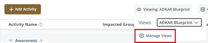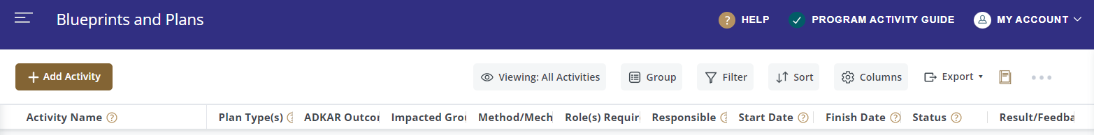 - ADKAR Blueprint - Displays activities grouped by ADKAR Outcome, with configured columns. (This is the current default view for users when they click into the Blueprints and Plans page)