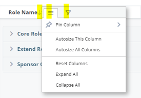 - [Reset Columns] removes any column formatting made by the user. It will not reset the content, just the formatting of the columns (i.e. if a user autosizes the columns and pins a column to the left, clicking Reset Columns will undo the autosize and pin).