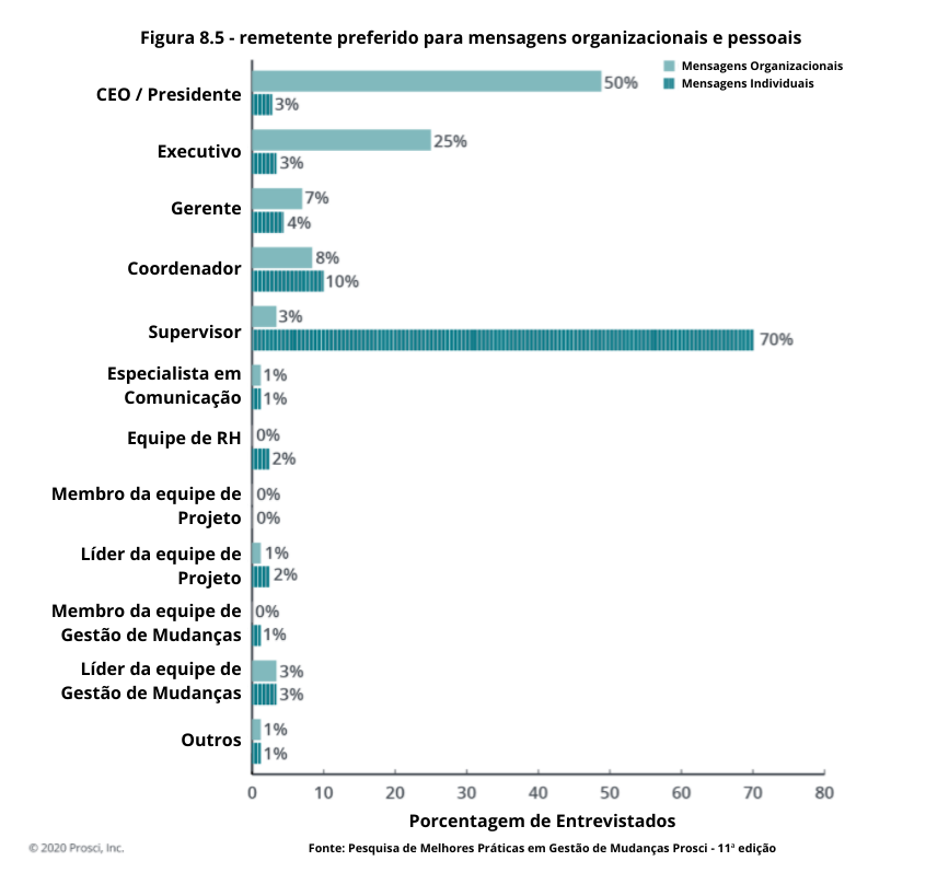 Os colaboradores preferem ouvir certas comunicações de certas funções dentro da organização em tempos de mudança. A Pesquisa de Melhores Práticas em Gestão de Mudanças Prosci mostra consistentemente quem são esses emissores preferidos e as mensagens que eles devem comunicar.