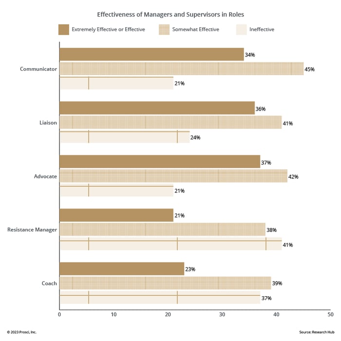 Os participantes da nossa pesquisa citam os papéis de Coach e Gestor de Resistência como os dois papéis com as quais os líderes mais lutam. Isto ocorre porque estes papéis do CLARC muitas vezes representam tarefas e desafios fora do conjunto geral de competências dos líderes. Infelizmente, os dados também mostram que apenas 35% dos participantes do estudo afirmam que fornecem formação , preparação e apoio adequados aos líderes para os seus papéis na mudança.