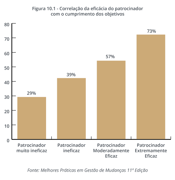 Quando os patrocinadores falham em liderar pelo exemplo, promover ou defender a mudança de forma adequada ou, em outras palavras, “fazer o que falam” para uma mudança bem-sucedida, eles podem impactar negativamente as chances de sucesso de um projeto. Resumindo, as pessoas geralmente não se comprometem com uma mudança mais do que o patrocinador. E a pesquisa da Prosci mostra consistentemente que projetos com um patrocínio extremamente eficaz atingem ou superam os objetivos mais de duas vezes com mais frequência do que projetos com um patrocínio muito ineficaz.