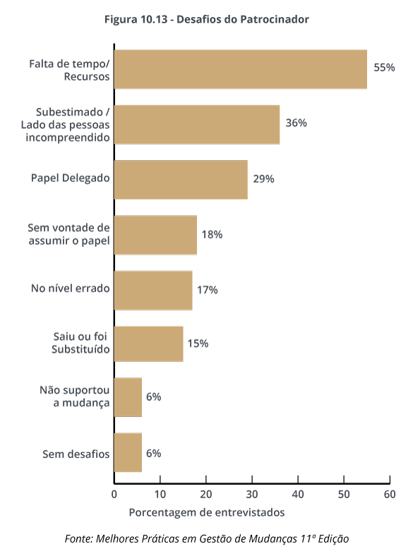 Por quê? O motivo mais comum é que os patrocinadores não entendem seu papel. No estudo, as equipes de projeto relatam que metade de seus patrocinadores não entende ou tem apenas algum entendimento de seu papel na gestão do lado humano da mudança. E 36% dos participantes relatam que seu patrocinador subestimou ou interpretou mal os impactos de um projeto nas pessoas. Consequentemente, apenas 33% dos entrevistados consideraram seus patrocinadores eficazes ou altamente eficazes na construção de uma coalizão de apoio.